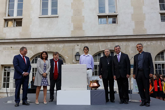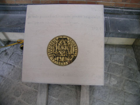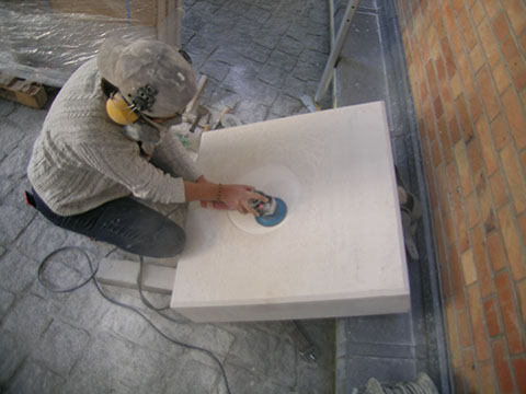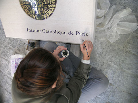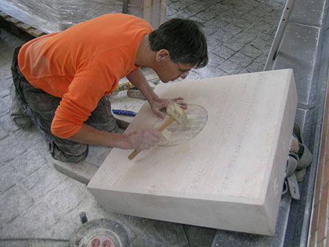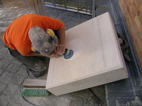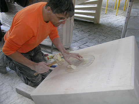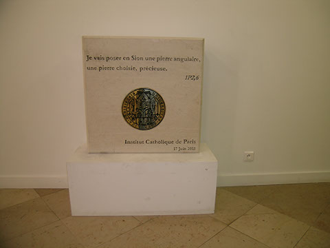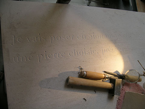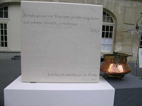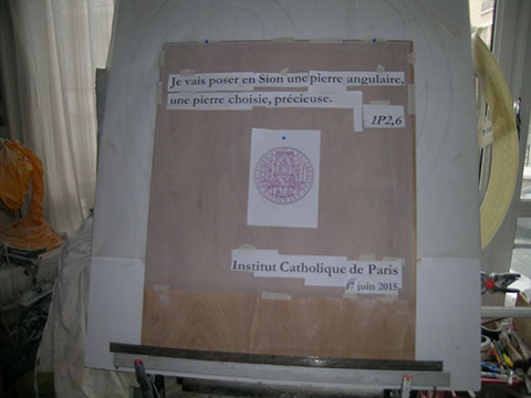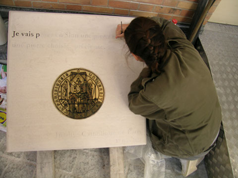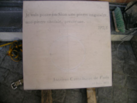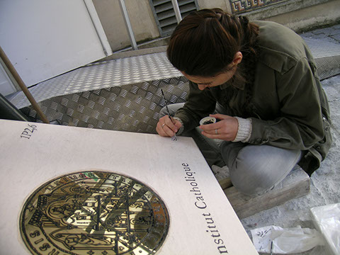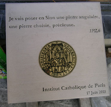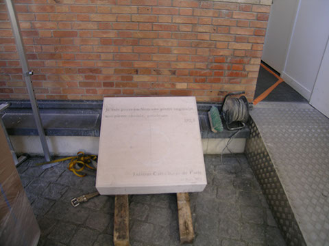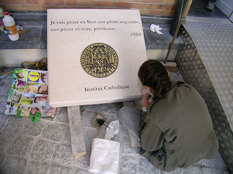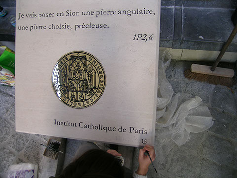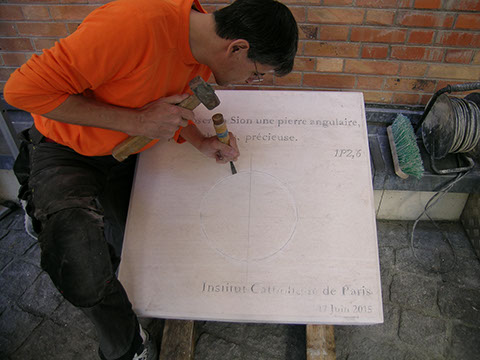 Photo de chantier de création d'une pierre d'inauguration pour l'Institut Catholique de Paris. Lien ICP