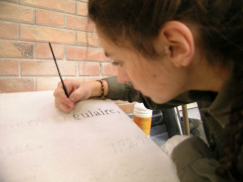 Exécution de la polychromie des lettres en noir par Emmanuelle Coustenoble.