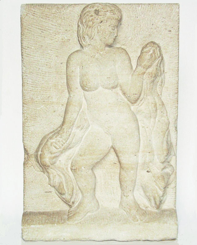 Femme nue au drapé regardant sa main. Le souffle du vent agite son drapé en tafta.