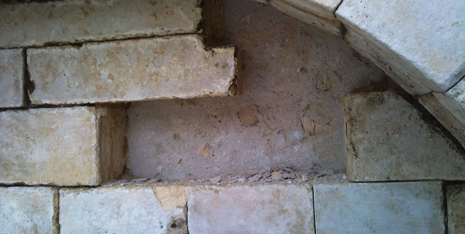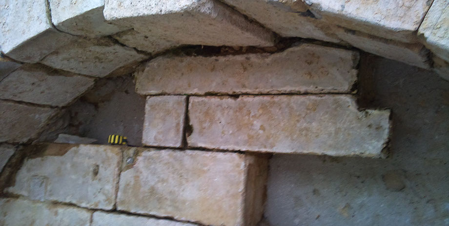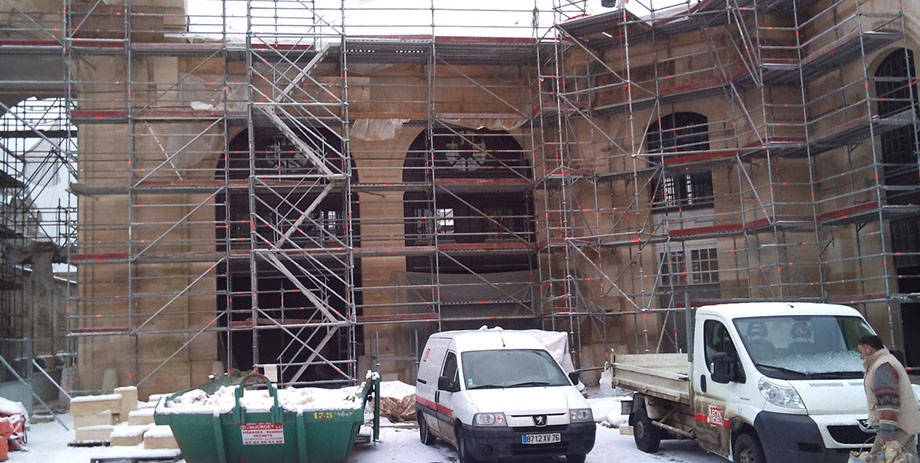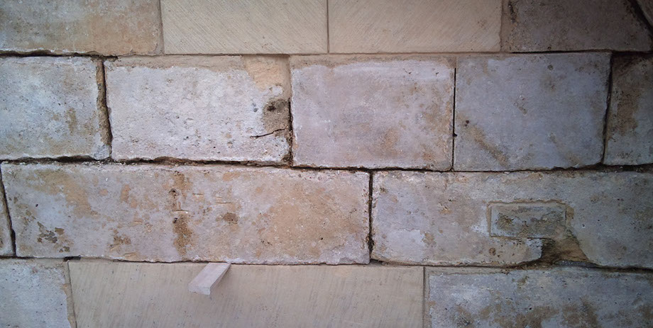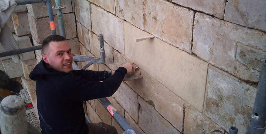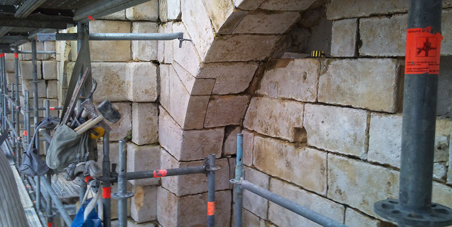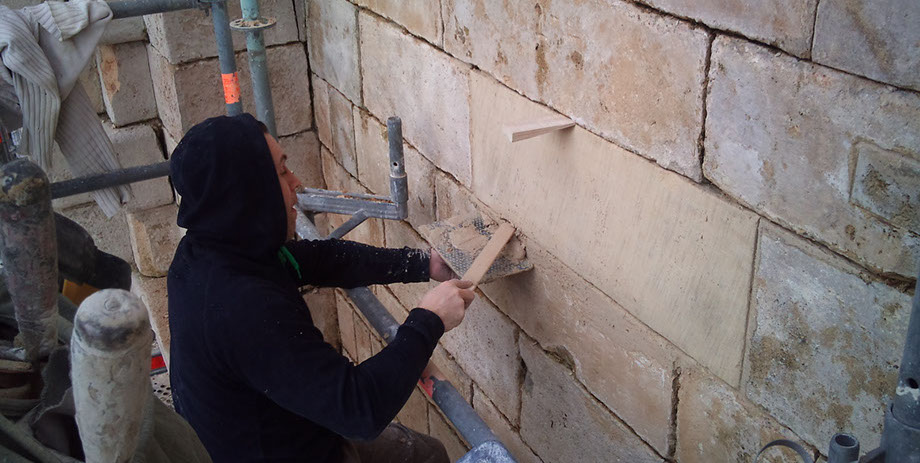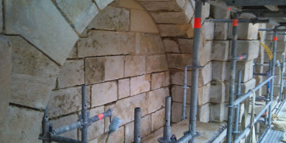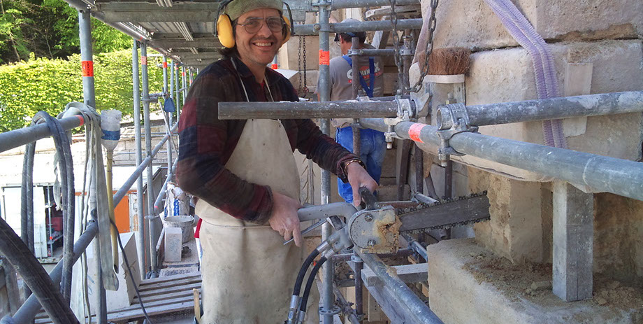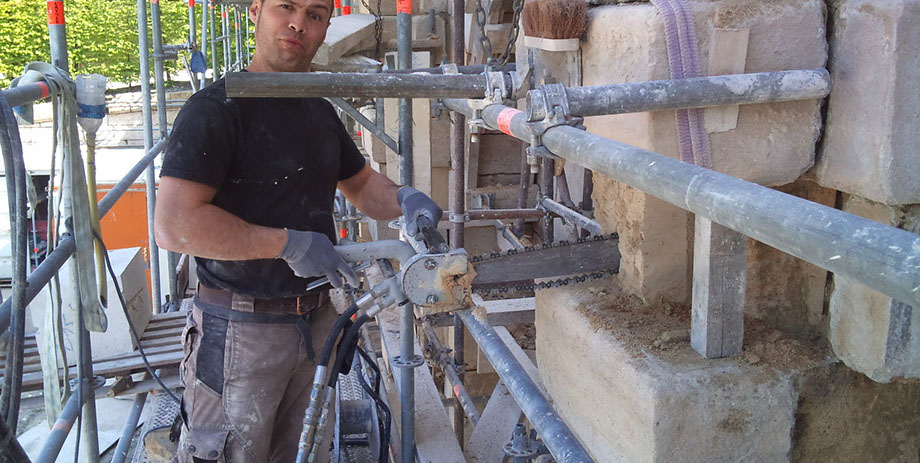 Remplacement en tiroirs des pierres, refouillements avec une tronçonneuse hydraulique à chaîne carbure (Maryline).